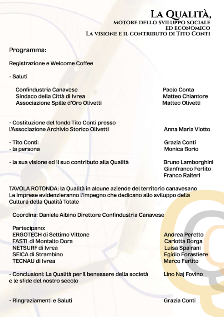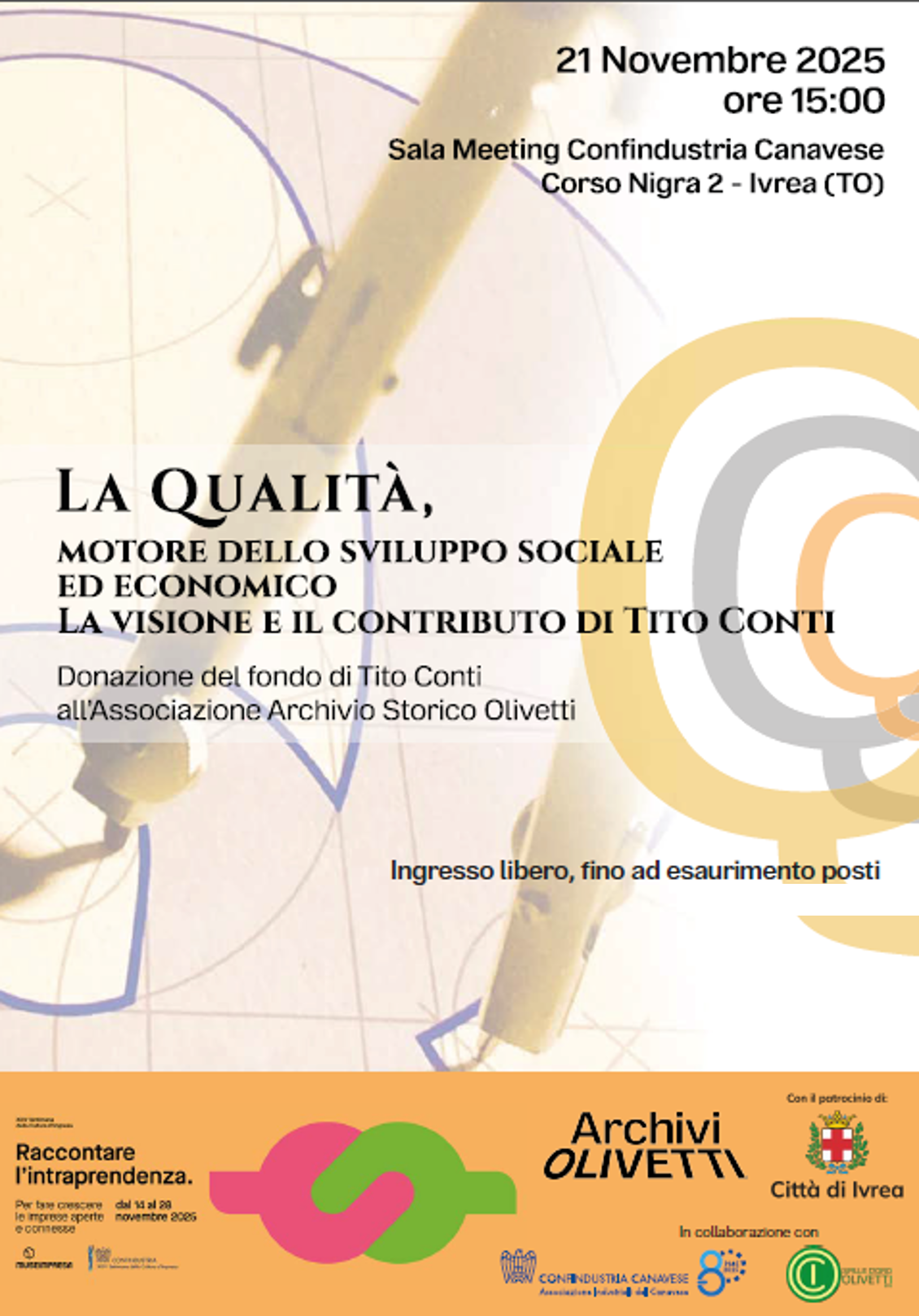 le Spille d’Oro Olivetti, con Confindustria Ivrea e Associazione Archivio Storico Olivetti, partecipano all’iniziativa promossa dalla famiglia Conti per ricordare Tito, il suo lavoro nella ricerca e divulgazione della Qualità ed i successi ottenuti in Olivetti e in campo internazionale, testimoniati dagli elevati riconoscimenti e incarichi in Italia e all’estero.