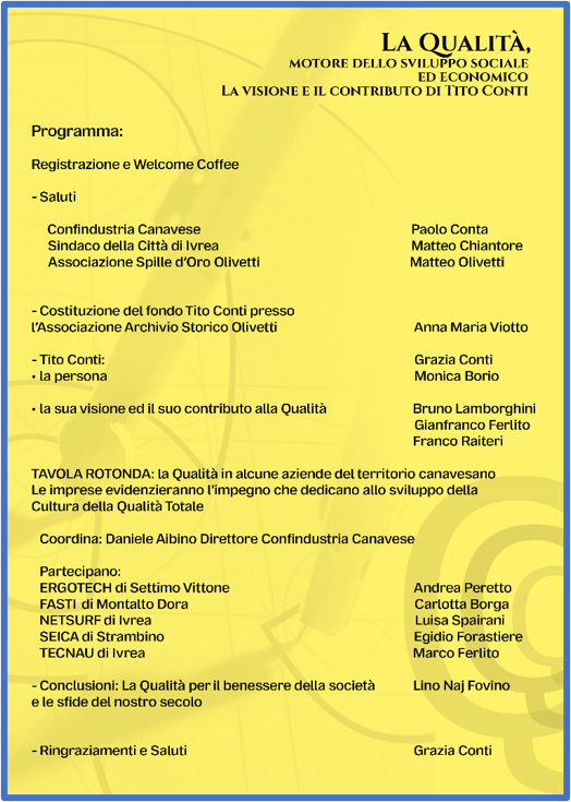 Il 21 novembre scorso, nella sala conferenze di Confindustria Canavese, sono stati commemorati la figura e il pensiero dell’ ing. Tito Conti, in Olivetti dal marzo del 1957 a fine 1991 con un importante percorso aziendale e successivo, che lo ha portato ad essere membro di istituzioni operanti nel campo della Qualità a livello mondiale e docente di università italiane ed estere. L’evento è stato patrocinato da Città di Ivrea, Confindustria Canavese, Archivio Storico Olivetti, Spille d’Oro Olivetti ed è stato inserito, su proposta dell’Archivio Storico Olivetti, nell’ambito delle manifestazioni della XXIV Settimana della Cultura d’Impresa. La commemorazione è stata anche occasione per celebrare la donazione all’Archivio Storico Olivetti, da parte della famiglia Conti, dell’importante biblioteca sulla Qualità di questo uomo di scienza, da annoverare fra i massimi esperti mondiali.
